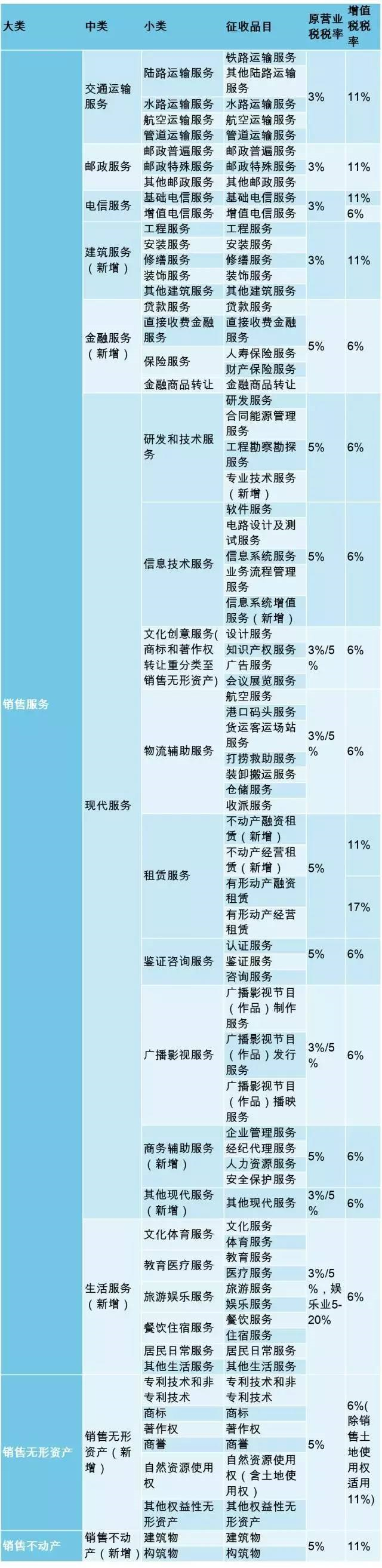其中,銷售無(wú)形資產(chǎn)和不動(dòng)產(chǎn)是這次新增的兩個(gè)大類。每個(gè)大類會(huì)再作細(xì)分,例如銷售服務(wù)細(xì)分為七個(gè)類別: