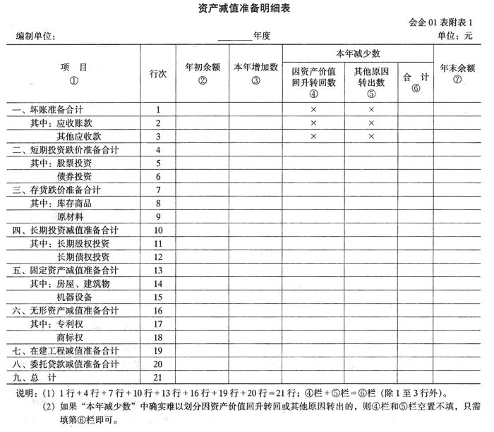 答:根據(jù)《企業(yè)會(huì)計(jì)制度》及相關(guān)會(huì)計(jì)準(zhǔn)則的規(guī)定,企業(yè)應(yīng)在對(duì)外提供的財(cái)務(wù)報(bào)告中披露有關(guān)資產(chǎn)減值準(zhǔn)備的信息。企業(yè)在會(huì)計(jì)報(bào)表附注中披露資產(chǎn)減值準(zhǔn)備減少的信息時(shí),應(yīng)區(qū)分由于資產(chǎn)價(jià)值回升而產(chǎn)生的資產(chǎn)減值準(zhǔn)備轉(zhuǎn)回的金額和由于其他原因(如出售該項(xiàng)資產(chǎn)、非貨幣性交易、債務(wù)重組等)所轉(zhuǎn)出的資產(chǎn)減值準(zhǔn)備的金額兩類信息。有關(guān)資產(chǎn)減值準(zhǔn)備明細(xì)表改按以下格式編報(bào):