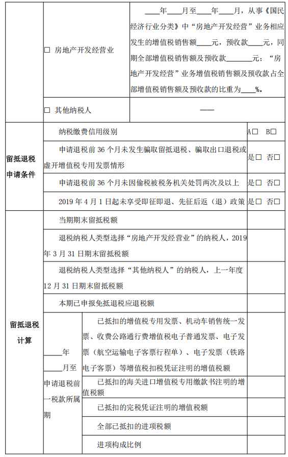 十三、退稅納稅人類型:按照《財(cái)政部 稅務(wù)總局關(guān)于完善增值稅期末留抵退稅政策的公告》(財(cái)政部 稅務(wù)總局公告 2025 年第 7 號(hào),以下簡稱 7 號(hào)公告)第一條第一項(xiàng)規(guī)定申請留抵退稅的納稅人,根據(jù)其“制造業(yè)”“科學(xué)研究和技術(shù)服務(wù)業(yè)”“軟件和信息技術(shù)服務(wù)業(yè)”“生態(tài)保護(hù)和環(huán)境治理業(yè)”中銷售收入占比最高的一項(xiàng)選擇;按照 7 號(hào)公告第一條第二項(xiàng)規(guī)定申請留抵退稅的納稅人,選擇“房地產(chǎn)開發(fā)經(jīng)營業(yè)”;按照 7 號(hào)公告第一條第三項(xiàng)規(guī)定申請留抵退稅的納稅人,選擇“其他納稅人”。退稅納稅人類型選擇“制造業(yè)”“科學(xué)研究和技術(shù)服務(wù)業(yè)”“軟件和信息技術(shù)服務(wù)業(yè)”或“生態(tài)保護(hù)和環(huán)境治理業(yè)”的納稅人,應(yīng)填寫“ 年 月至 年 月,從事《國民經(jīng)濟(jì)行業(yè)分類》中‘制造業(yè)’‘科學(xué)研究和技術(shù)服務(wù)業(yè)’‘軟件和信息技術(shù)服務(wù)業(yè)’‘生態(tài)保護(hù)和環(huán)境治理業(yè)’業(yè)務(wù)相應(yīng)發(fā)生的增值稅銷售額 元,同期全部增值稅銷售額 元,占比 %。”如申請退稅前經(jīng)營期滿 12 個(gè)月,本欄起止時(shí)間填寫申請退稅前 12 個(gè)月的起止時(shí)間,本欄銷售額填寫申請退稅前 12 個(gè)月的銷售額;如申請退稅前經(jīng)營期不滿 12 個(gè)月但滿 3 個(gè)月的,本欄起止時(shí)間填寫實(shí)際經(jīng)營期的起止時(shí)間,本欄銷售額填寫實(shí)際經(jīng)營期的銷售額。退稅納稅人類型選擇“房地產(chǎn)開發(fā)經(jīng)營業(yè)”的納稅人,應(yīng)填寫“ 年 月至 年 月,從事《國民經(jīng)濟(jì)行業(yè)分類》中‘房地產(chǎn)開發(fā)經(jīng)營’業(yè)務(wù)相應(yīng)發(fā)生的增值稅銷售額 元,預(yù)收款 元,同期全部增值稅銷售額及預(yù)收款元,‘房地產(chǎn)開發(fā)經(jīng)營’業(yè)務(wù)增值稅銷售額及預(yù)收款占全部增值稅銷售額及預(yù)收款的比重為 %?!比缟暾埻硕惽敖?jīng)營期滿 12 個(gè)月,本欄起止時(shí)間填寫申請退稅前 12 個(gè)月的起止時(shí)間,本欄銷售額和預(yù)收款填寫申請退稅前 12 個(gè)月的銷售額和預(yù)收款;如申請退稅前經(jīng)營期不滿 12 個(gè)月但滿 3 個(gè)月的,本欄起止時(shí)間填寫實(shí)際經(jīng)營期的起止時(shí)間,本欄銷售額和預(yù)收款填寫實(shí)際經(jīng)營期的銷售額和預(yù)收款。